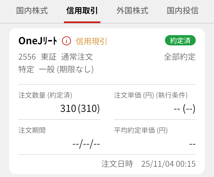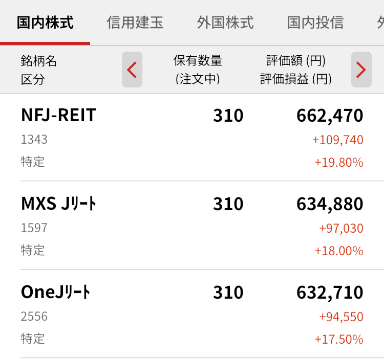 そして順調に含み益を伸ばしているなか、2025/10/30にレーザーテック(6920)を利益確定した238万で、これらJ-REITを一部現引したのである。2556、1343、1597いずれも均等に310口ずつ現引した。