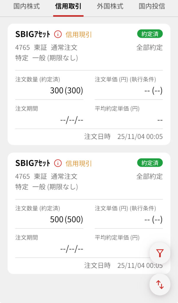 突然の最終回。2025/10/30にレーザーテック(6920)を利益確定した238万で、一般信用での信用買いしていたSBIグローバルアセットマネジメント(4765)の残800/1000株から800株すべて現引した。前回の現引報告では全500株の予定だったが、Xでお伝えした通り記念優待が出ることを知りもう500株追加して全1000株に増やしていた。