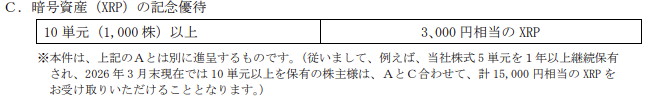詳しくはTDnet 適時開示情報閲覧サービスを見ていただきたいのだが、従来5単元(500株)持っていればXRPがもらえていたのだが、今回は記念優待で10単元(1,000株)あれば更に3,000円相当のXRPをもらえるのである。
