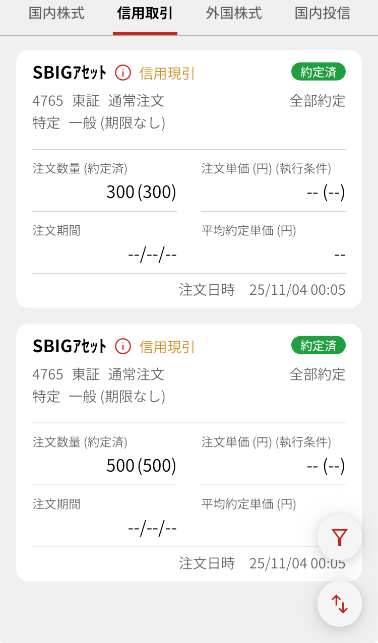 突然の最終回。2025/10/30にレーザーテック(6920)を利益確定した238万で、一般信用での信用買いしていたSBIグローバルアセットマネジメント(4765)の残800/1000株から800株すべて現引した。前回の現引報告では全500株の予定だったが、Xでお伝えした通り記念優待が出ることを知りもう500株追加して全1000株に増やしていた。