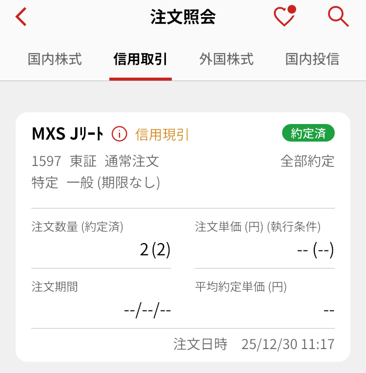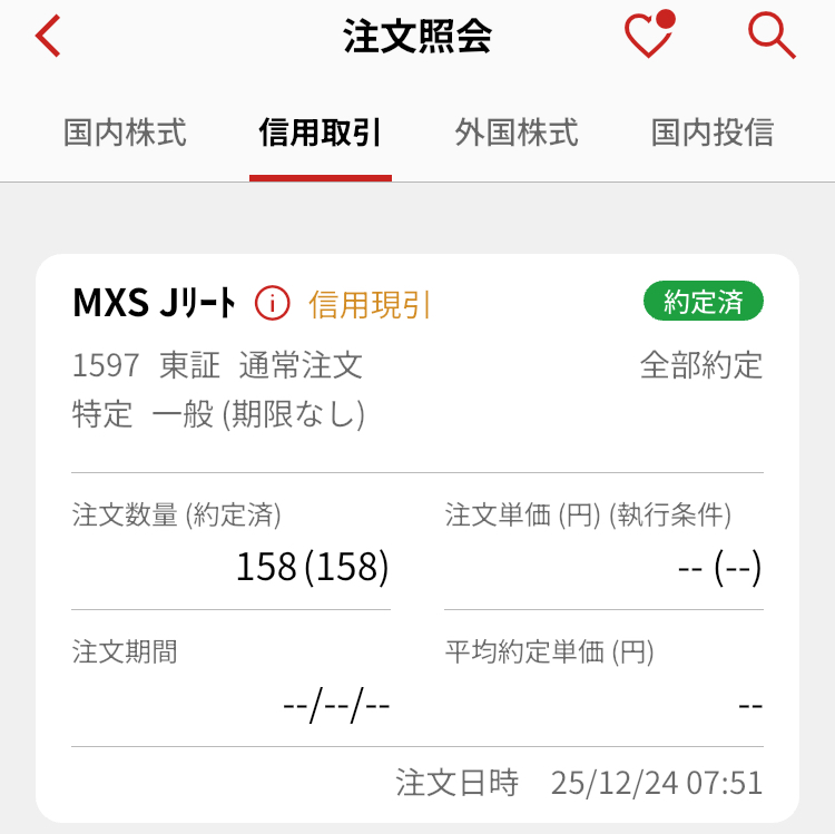 MAXIS Jリート上場投信(1597)はもともと売買単位が10口だったのだが、2025年9月6日に売買単位を1口に変更するという大変迷惑なことをされたせいで、信用取引で長期ホールドしていると権利処理等手数料が今までの10倍かかるようになってしまった。そのため、買い建てている売買単位10口の1343、2556よりも1597を優先して現引せざるを得ないのである。